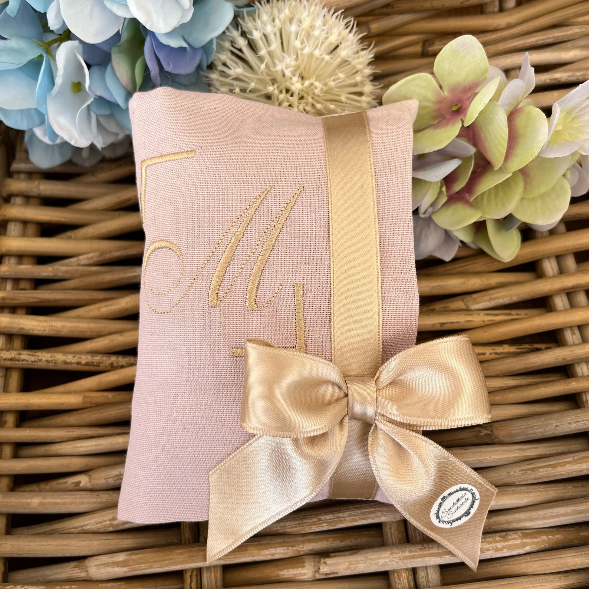 Bustina modello libro portaconfetti con personalizzazione ricamata, realizzata in tessuto tinta unita lilla, dimensioni 14x11 cm, composizione 100% cotone. Il sacchetto viene venduto come in foto, con nastro da 2,5 cm, 9 confetti alla mandorla preincartati monodose e il bigliettino. È possibile scegliere il colore del nastro e il colore del ricamo tra le varianti proposte. Durante l'ordine, si prega di inserire nelle note le iniziali da ricamare (1 o 2) e i dettagli dell'evento da stampare sul biglietto (evento, nomi, data).