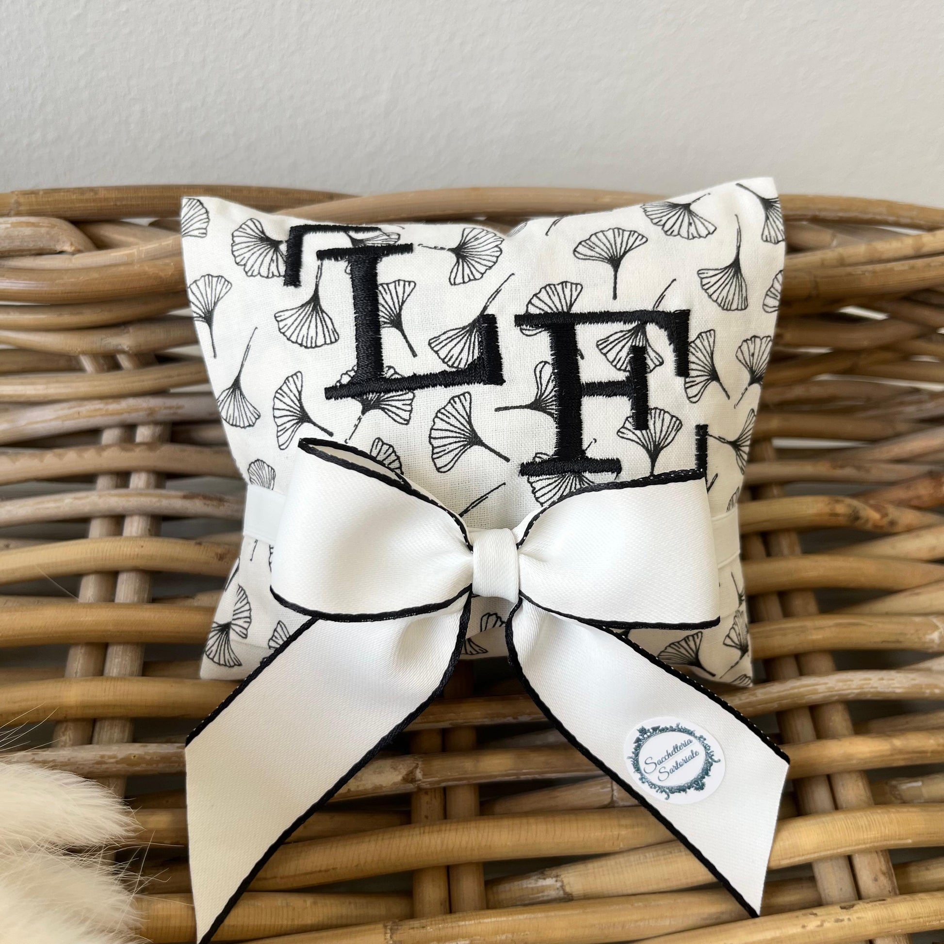 Bustina modello maxi portaconfetti con personalizzazione ricamata, realizzata in tessuto stampato tema ginkgo biloba bianco e nero, dimensioni 12x11 cm, composizione 100% cotone. Il sacchetto viene venduto come in foto, con nastro da 2,5 cm e 1 cm, 7 confetti alla mandorla preincartati monodose e il bigliettino. Durante l'ordine, si prega di inserire nelle note le iniziali da ricamare (1 o 2) e i dettagli dell'evento da stampare sul biglietto (evento, nomi, data).