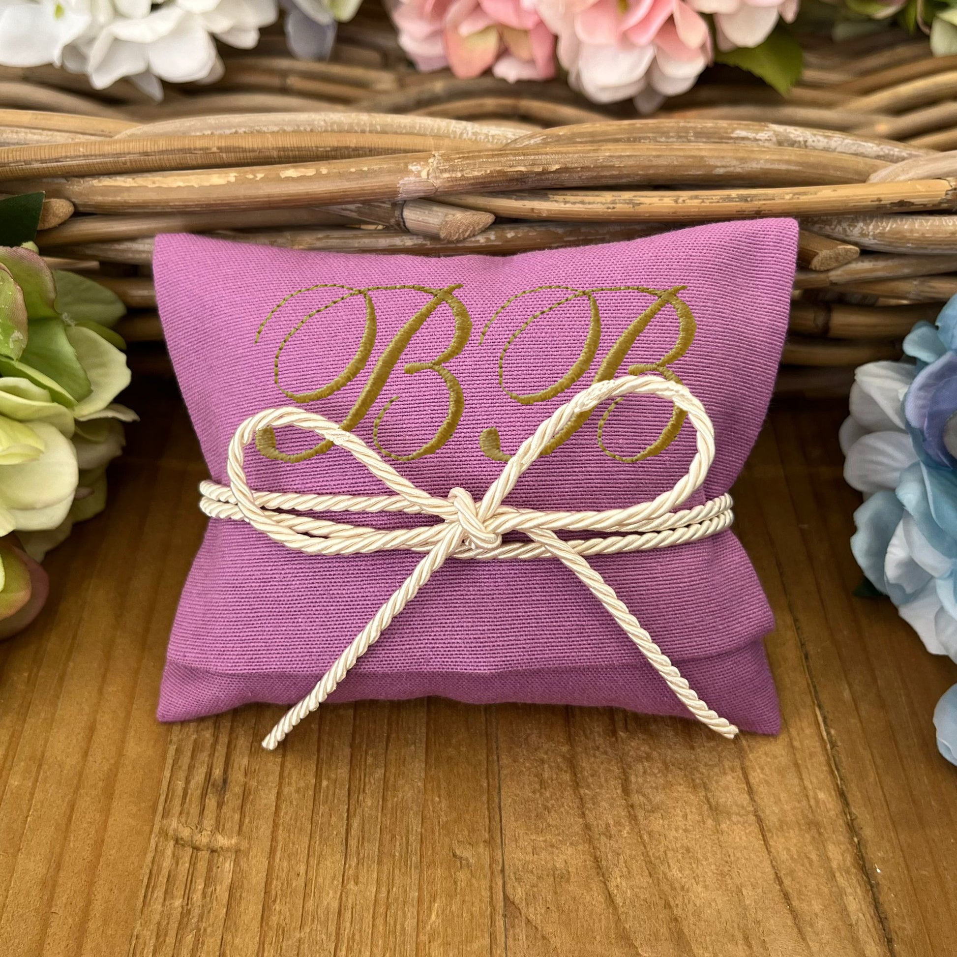 Bustina portaconfetti con personalizzazione ricamata, realizzata in tessuto glicine, dimensioni 12x11 cm, composizione 60% cotone 40% poliestere. Il sacchetto viene venduto come in foto, con cordino, 7 confetti alla mandorla preincartati monodose e il bigliettino. È possibile scegliere il colore del cordino e il colore del ricamo tra le varianti proposte. Durante l'ordine, si prega di inserire nelle note le iniziali ( da 1 a 3) o il nome da ricamare e i dettagli dell'evento da stampare sul biglietto (evento, nomi, data).