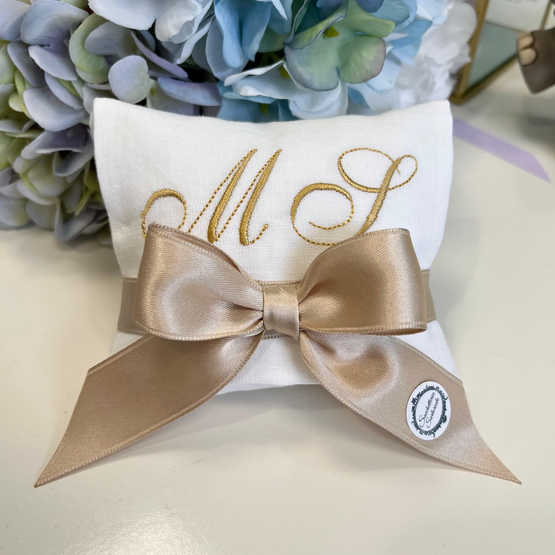Bustina portaconfetti con personalizzazione ricamata, realizzata in tessuto avorio, dimensioni 12x11 cm, composizione 55% cotone 45%lino. Il sacchetto viene venduto come in foto con 7 confetti alla mandorla d'Avola preincartati monodose e il bigliettino. Durante l'ordine, si prega di inserire nelle note le iniziali da ricamare (da 1 a 3) o il nome e i dettagli dell'evento da stampare sul biglietto (evento, nomi, data).