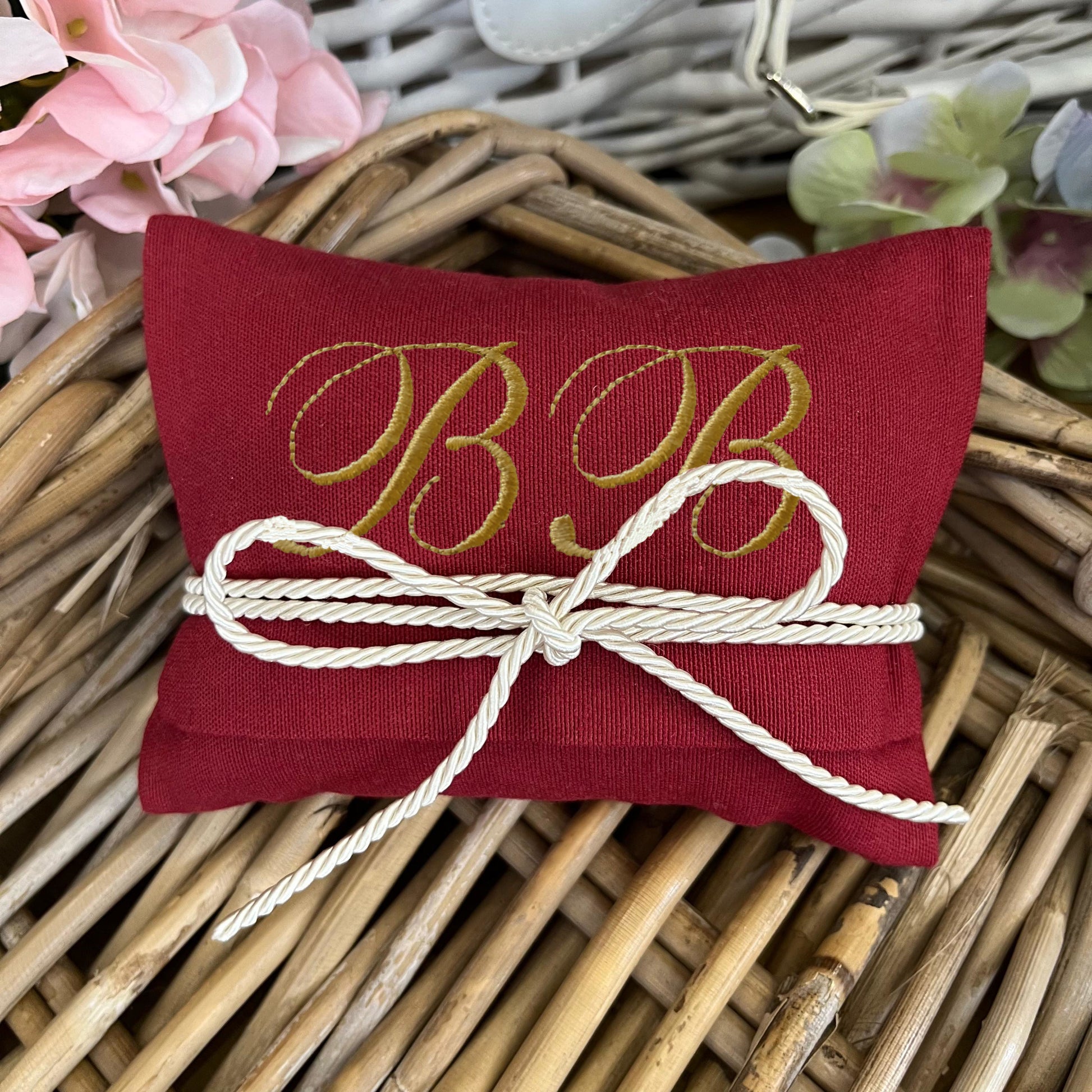 Bustina portaconfetti con personalizzazione ricamata, realizzata in tessuto rosso granata, dimensioni 14x11 cm, composizione 60% cotone 40% poliestere. Il sacchetto viene venduto come in foto, con cordino, 9 confetti alla mandorla preincartati monodose e il bigliettino. È possibile scegliere il colore del cordino e il colore del ricamo tra le varianti proposte. Durante l'ordine, si prega di inserire nelle note le iniziali ( da 1 a 3) o il nome da ricamare e i dettagli dell'evento da stampare sul biglietto (evento, nomi, data).