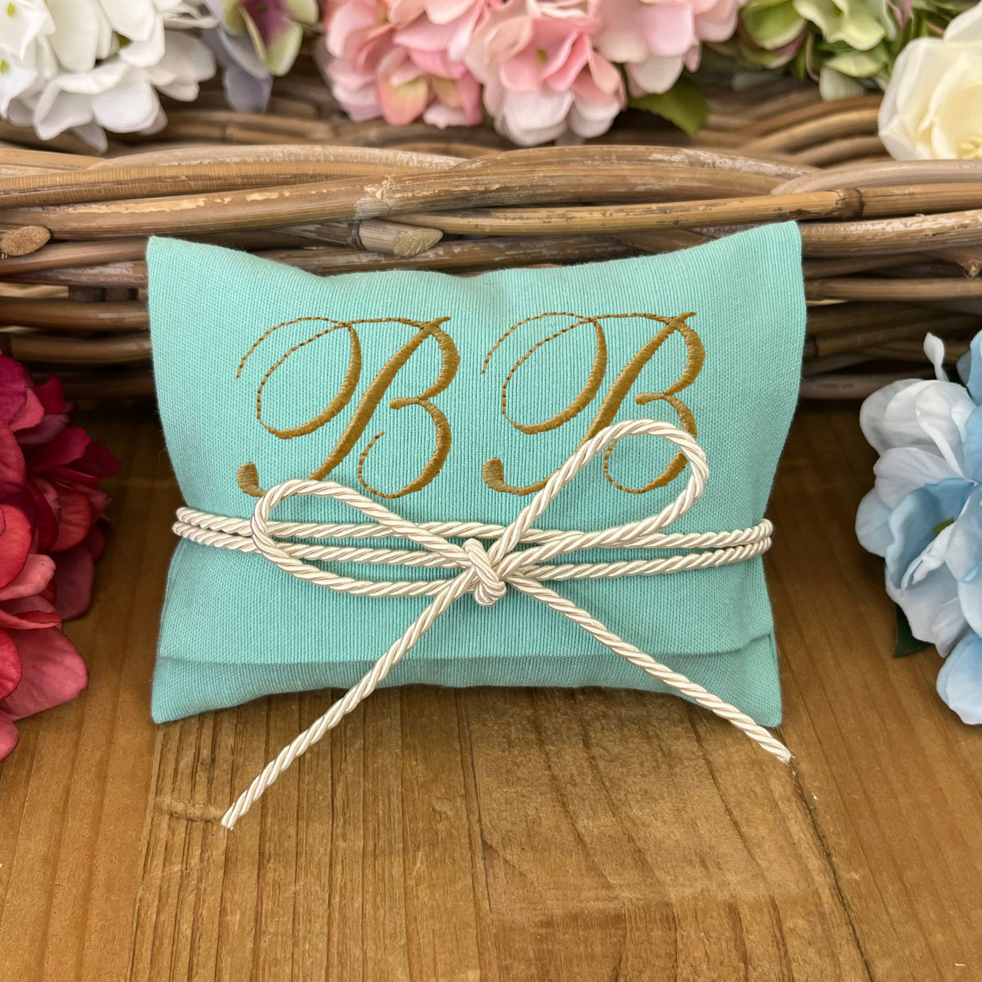 Bustina portaconfetti con personalizzazione ricamata, realizzata in tessuto verde acqua, dimensioni 14x11 cm, composizione 60% cotone 40% poliestere. Il sacchetto viene venduto come in foto, con cordino, 9 confetti alla mandorla preincartati monodose e il bigliettino. È possibile scegliere il colore del cordino e il colore del ricamo tra le varianti proposte. Durante l'ordine, si prega di inserire nelle note le iniziali ( da 1 a 3) o il nome da ricamare e i dettagli dell'evento da stampare sul biglietto (evento, nomi, data).