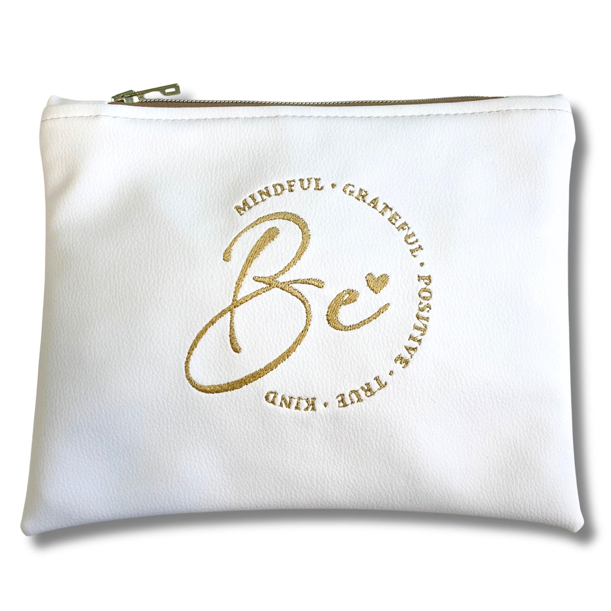 Pochette in similpelle bianca, impreziosita da un ricamo in filo oro. Le dimensioni del prodotto sono 24 x 19 cm. La composizione della superficie è 100% PVC, mentre il retro è realizzato in 100% poliestere. L'interno è foderato con cotone al 100%. La pochette viene fornita con una confezione regalo inclusa, perfetta per ogni occasione speciale.
