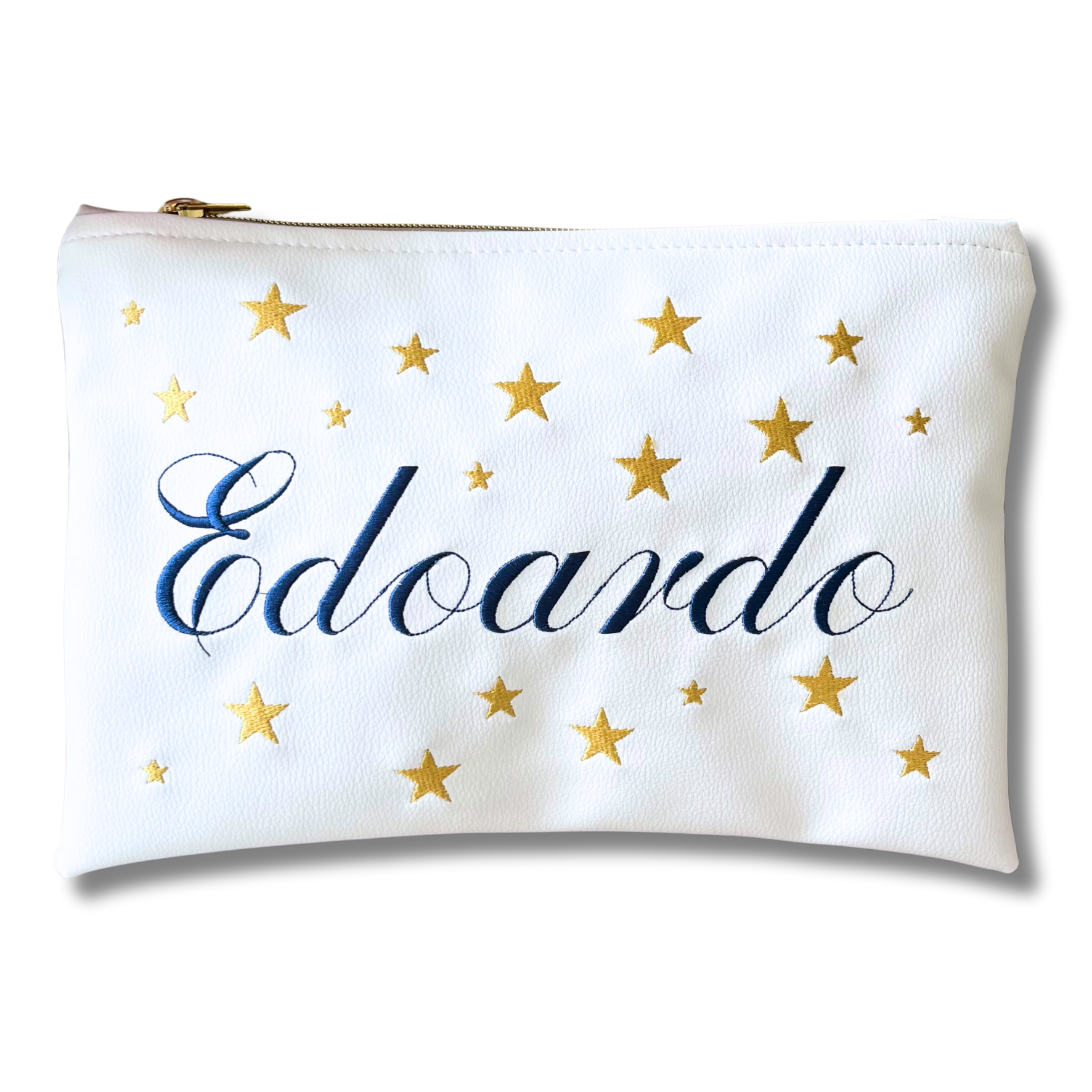 Pochette personalizzata con nome in similpelle bianca ric. blu stelle oro mod. plus