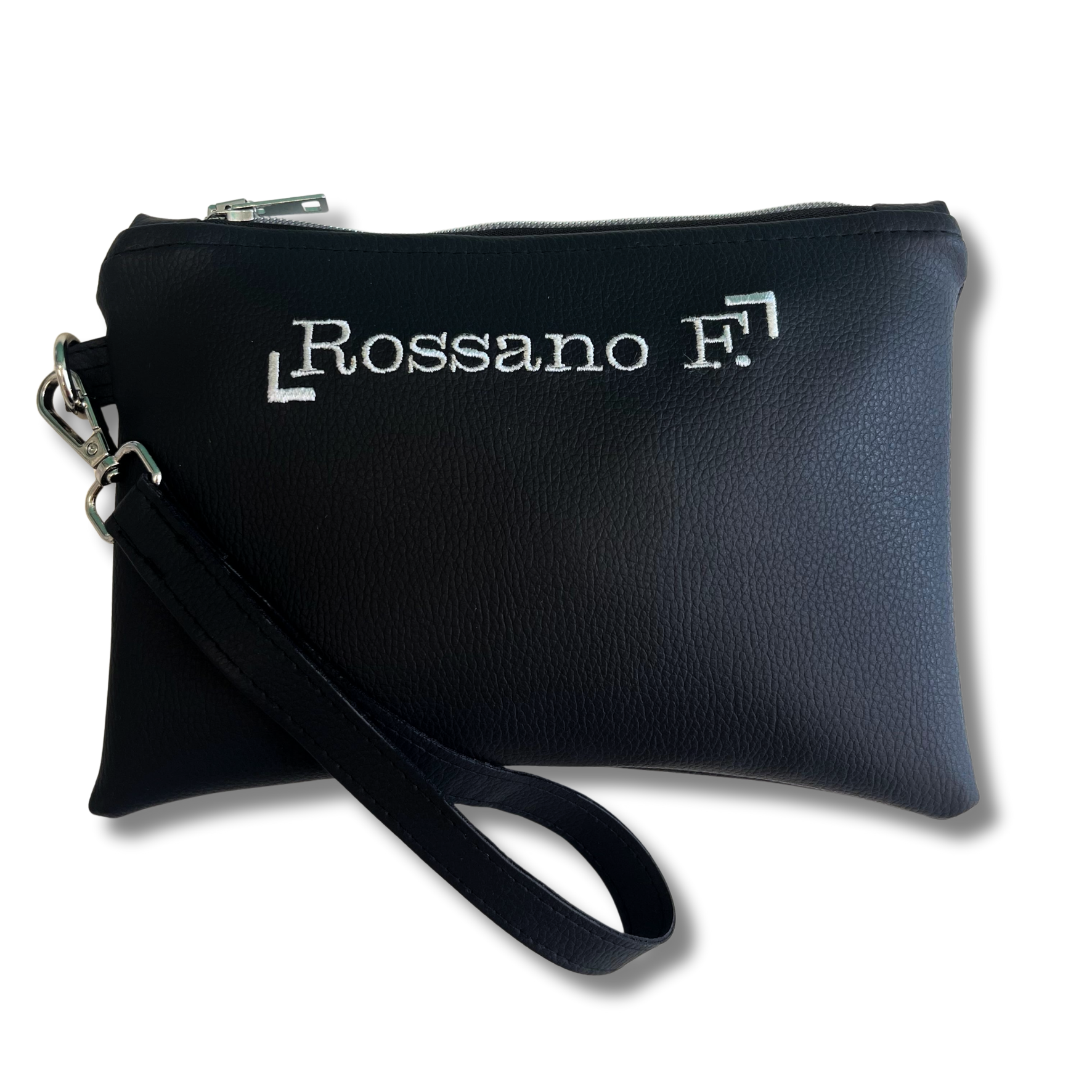 Pochette personalizzata con nome in similpelle nera con polsiera e ric. argento mod. uomo