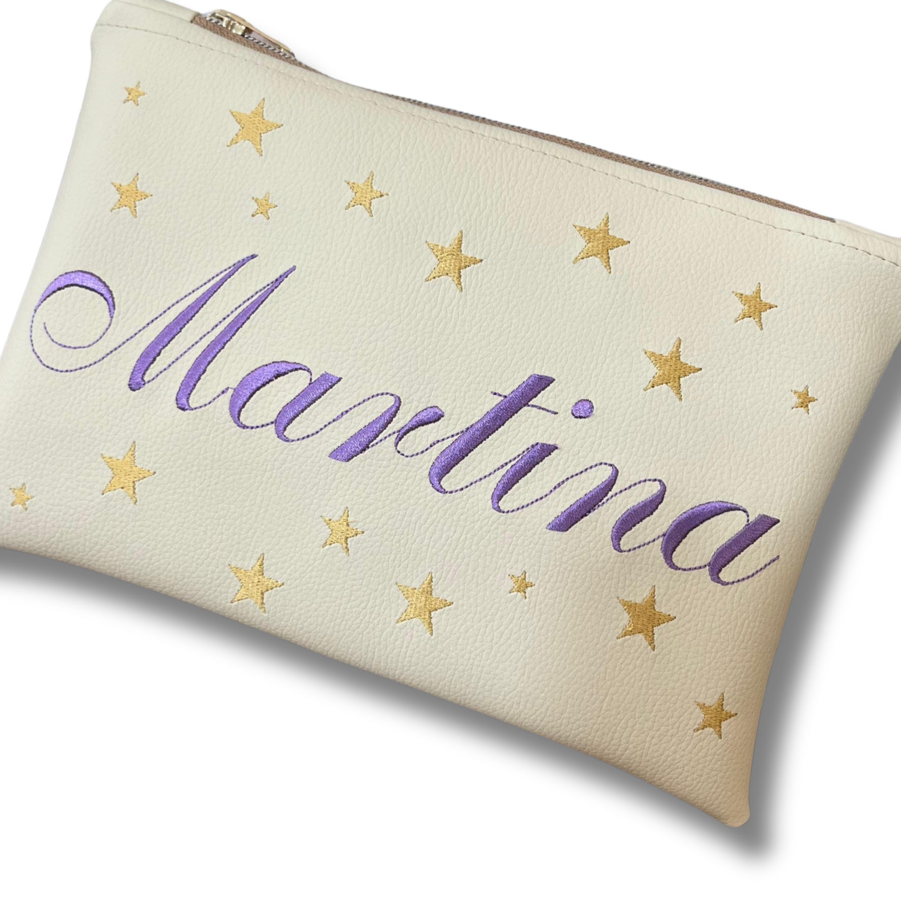 Pochette personalizzata con nome in similpelle panna ric. lilla stelle oro mod. plus