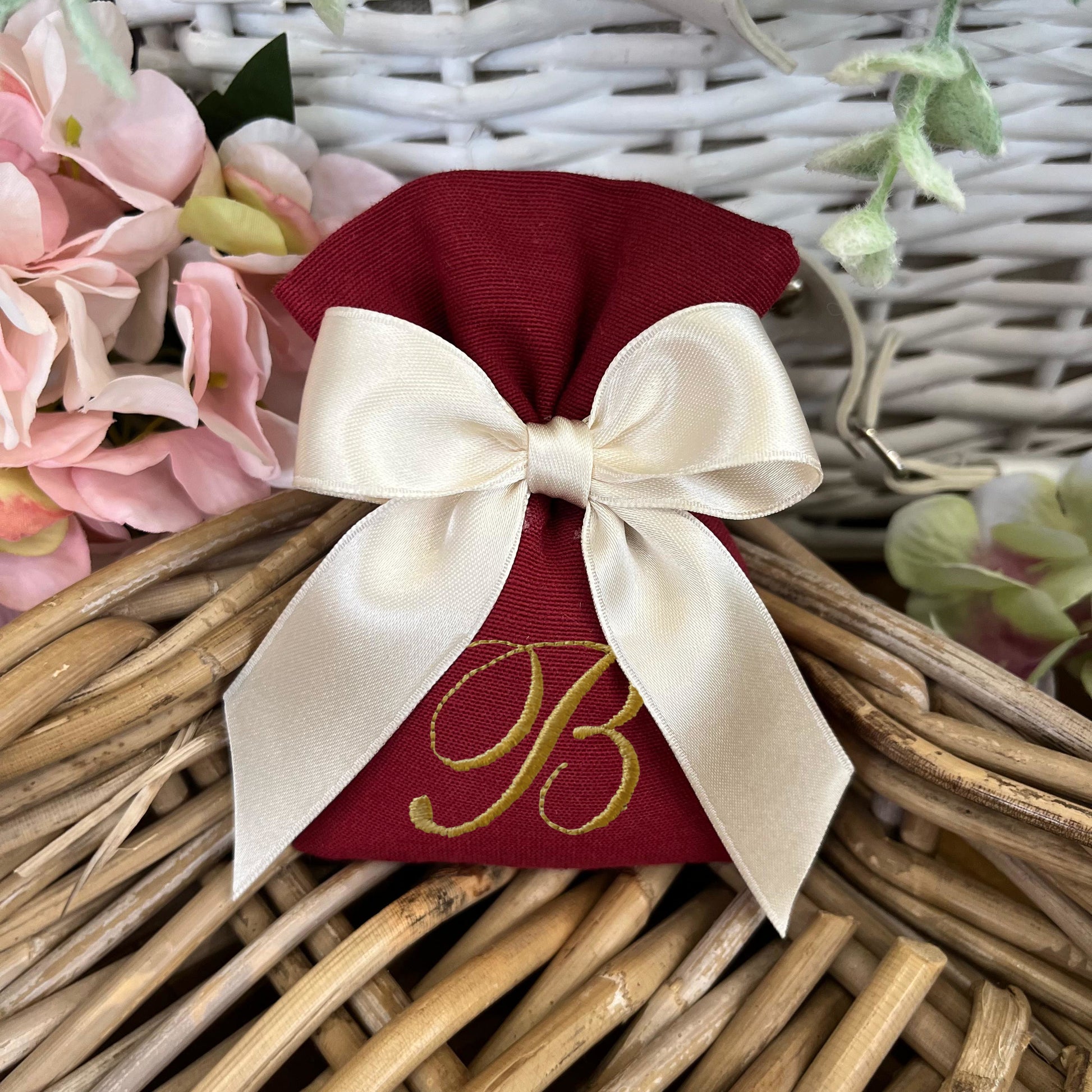 Sacchetto portaconfetti con personalizzazione ricamata, realizzato in tessuto rosso granata, dimensioni 9x13 cm, composizione 60% cotone 40% poliestere. Il sacchetto viene venduto come in foto, con nastro in doppio raso di 2,5 cm, 5 confetti alla mandorla preincartati monodose e il bigliettino. È possibile scegliere il colore del nastro e il colore del ricamo tra le varianti proposte. Durante l'ordine, si prega di inserire nelle note le iniziali da ricamare (1 oppure 2) e i dettagli dell'evento da stampare sul biglietto (evento, nomi, data).