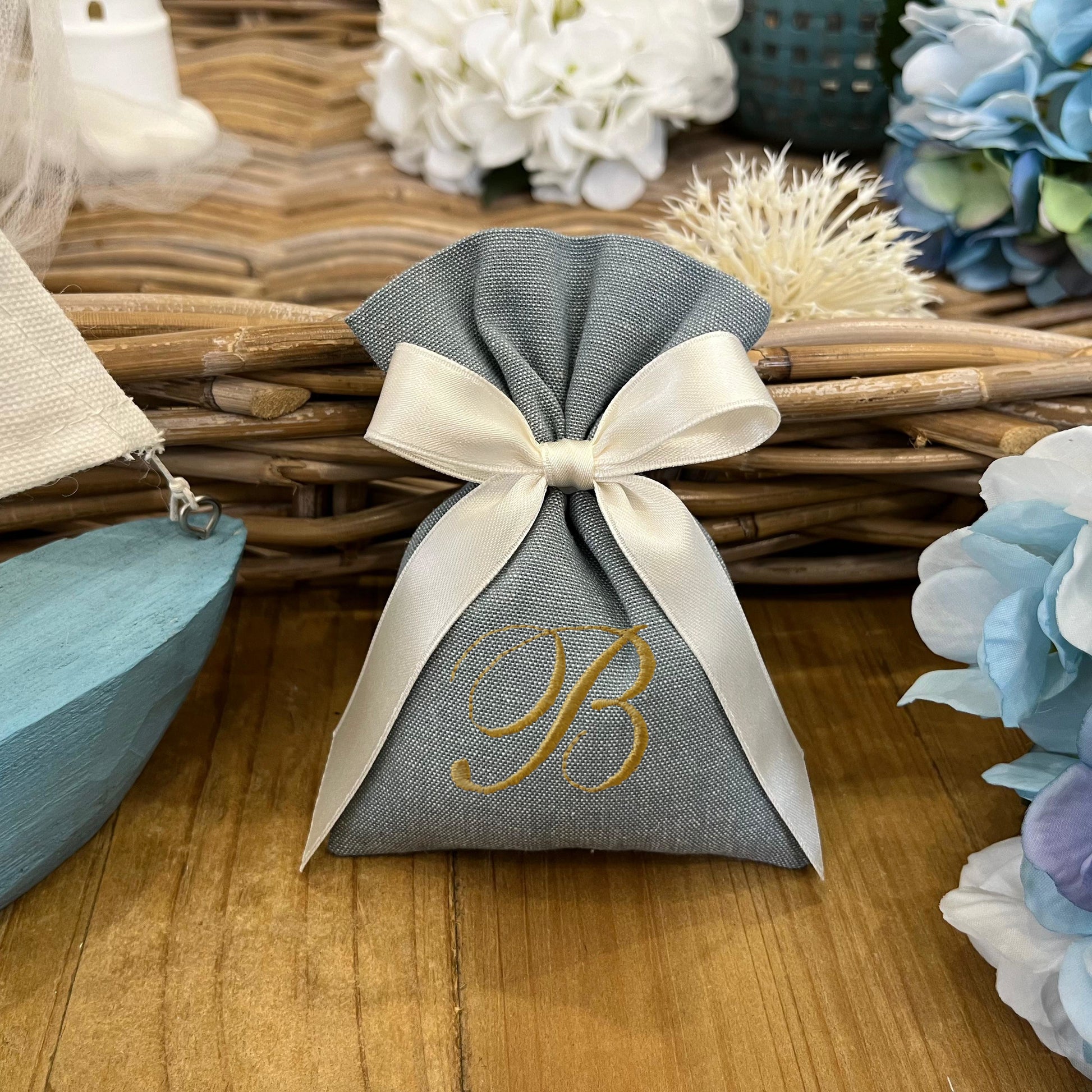 Sacchetto portaconfetti con personalizzazione ricamata, realizzato in tessuto tinta unita avio, dimensioni 9x13 cm, composizione 100% cotone. Il sacchetto viene venduto come in foto, con nastro in doppio raso da 1,5 cm, 5 confetti alla mandorla preincartati monodose e il bigliettino. È possibile scegliere il colore del nastro e il colore del ricamo tra le varianti proposte. Durante l'ordine, si prega di inserire nelle note le iniziali da ricamare (1 oppure 2) e i dettagli dell'evento da stampare sul biglietto (evento, nomi, data).