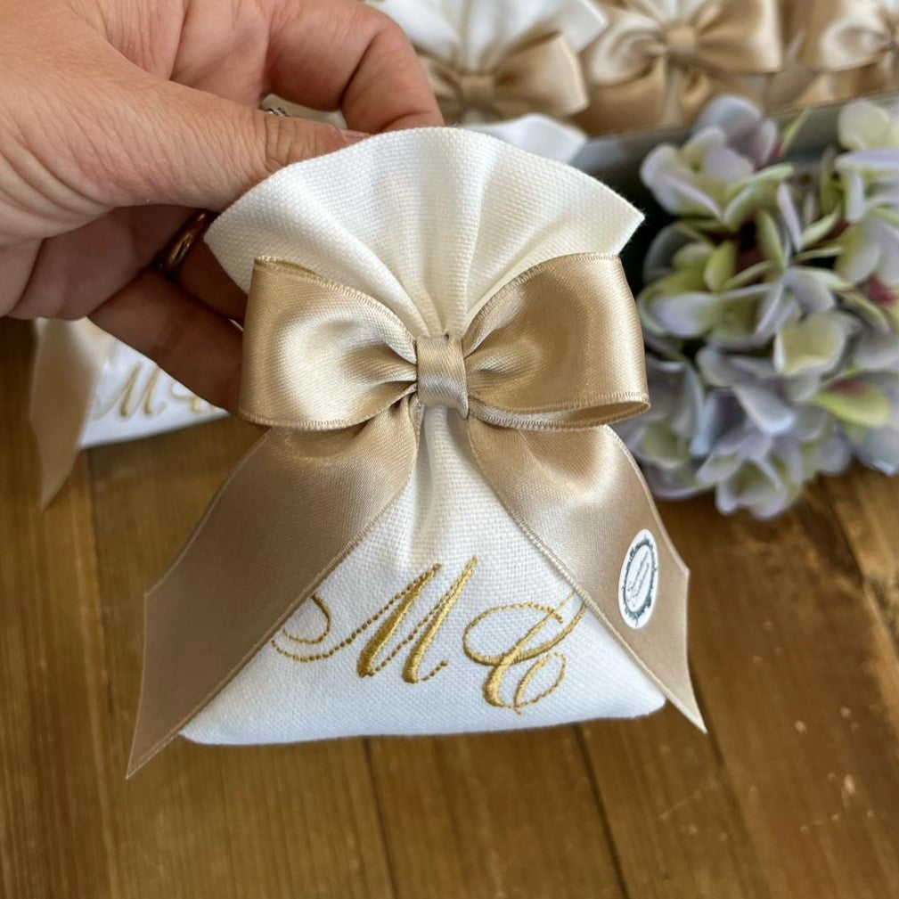 Sacchetto portaconfetti con personalizzazione ricamata, realizzato in tessuto bianco latte, dimensioni 9x13 cm, composizione 100% cotone. Il sacchetto viene venduto come in foto, con nastro in doppio raso da 2,5 cm, 5 confetti alla mandorla preincartati monodose e il bigliettino. È possibile scegliere il colore del nastro e il colore del ricamo tra le varianti proposte. Durante l'ordine, si prega di inserire nelle note le iniziali da ricamare (1 oppure 2) e i dettagli dell'evento da stampare sul biglietto (evento, nomi, data).