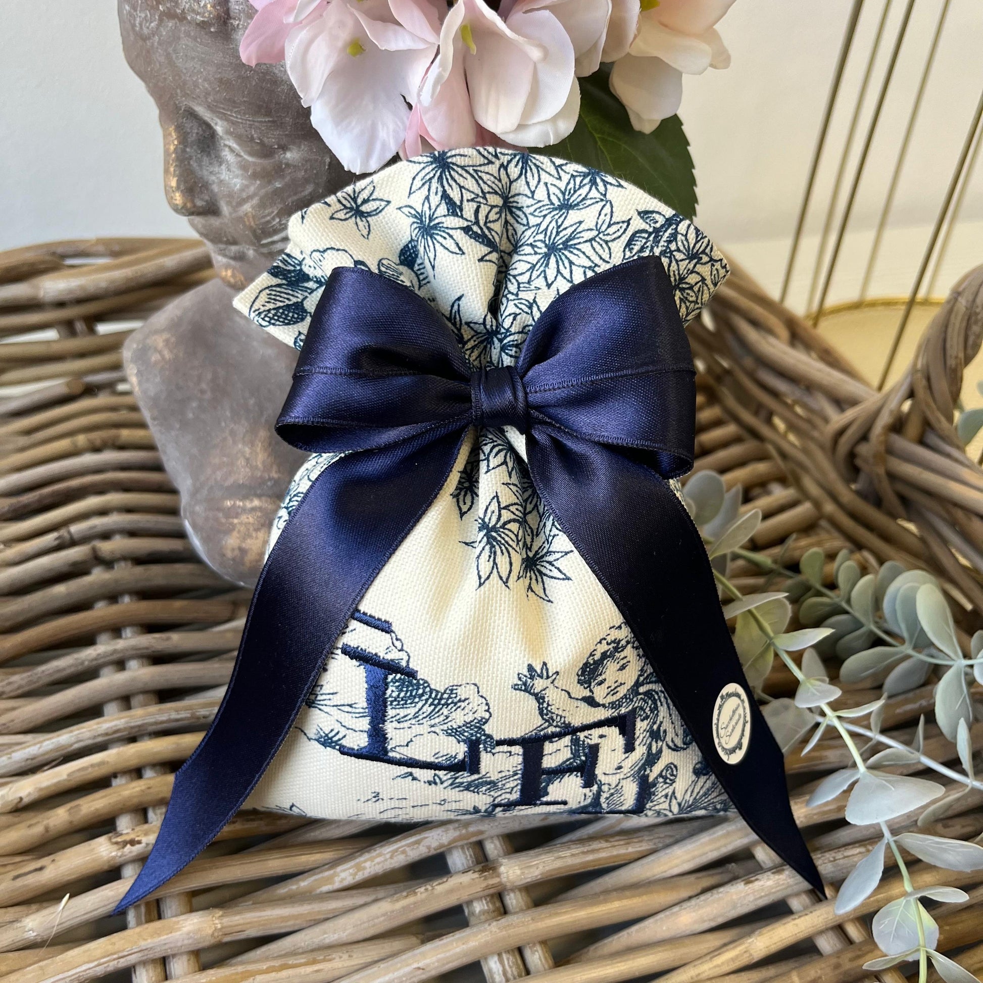 Sacchetto portaconfetti con personalizzazione ricamata, realizzata in tessuto toile de jouy blu, dimensioni 16x19 cm, composizione 80% cotone 20% poliestere. Il sacchetto viene venduto come in foto, con nastro da 2,5 cm, 11 confetti alla mandorla preincartati monodose e il bigliettino. Durante l'ordine, si prega di inserire nelle note le iniziali da ricamare (1 o 2) e i dettagli dell'evento da stampare sul biglietto (evento, nomi, data).