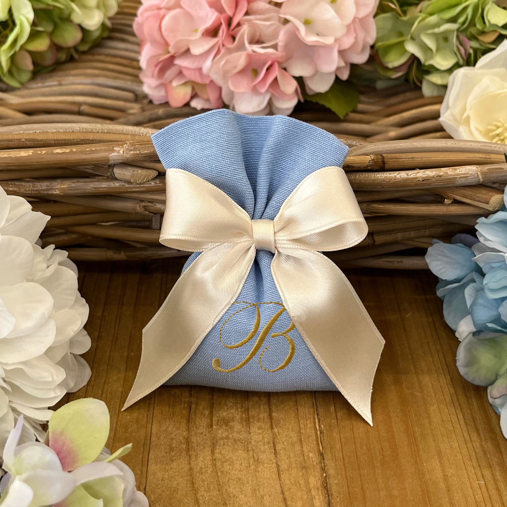 Sacchetto portaconfetti con personalizzazione ricamata, realizzato in tessuto cielo, dimensioni 9x13 cm, composizione 60% cotone 40% poliestere. Il sacchetto viene venduto come in foto, con nastro in doppio raso di 2,5 cm, 5 confetti alla mandorla preincartati monodose e il bigliettino. È possibile scegliere il colore del nastro e il colore del ricamo tra le varianti proposte. Durante l'ordine, si prega di inserire nelle note le iniziali da ricamare (1 oppure 2) e i dettagli dell'evento da stampare sul biglietto (evento, nomi, data).