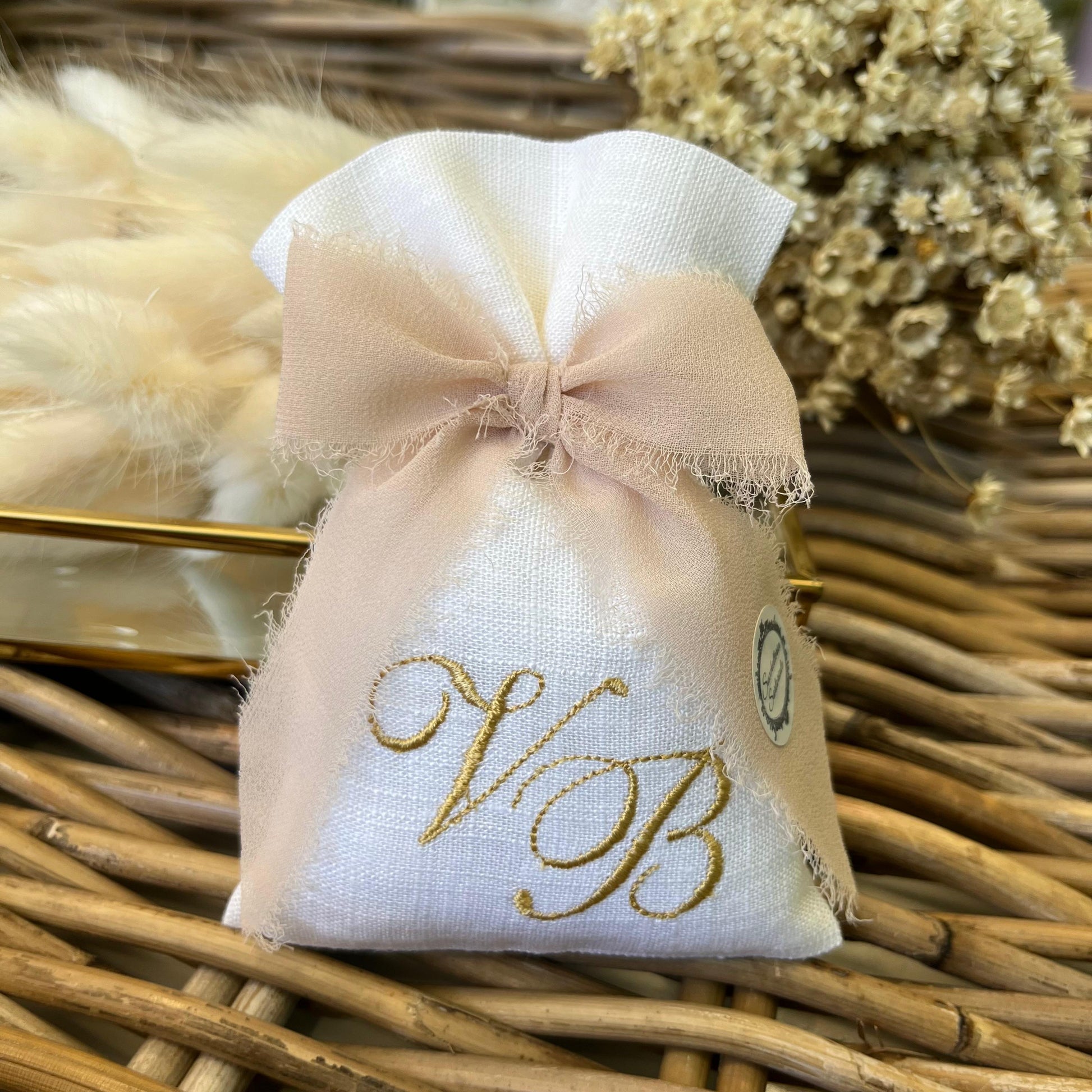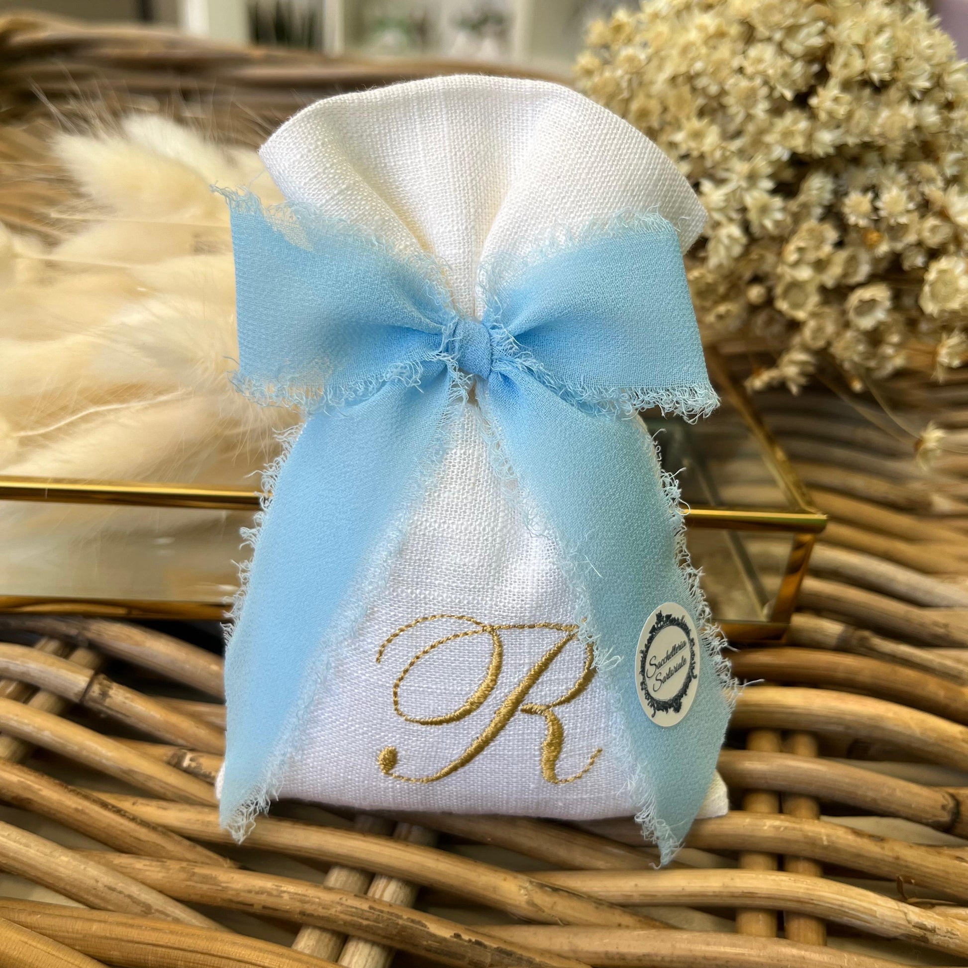 Sacchetto portaconfetti con personalizzazione ricamata, realizzato in tessuto avorio ,dimensioni 9x13 cm, composizione 55% viscosa 45%lino. Il sacchetto viene venduto come in foto, con nastro da 3 cm in chiffon d'organza, 5 confetti alla mandorla d'Avola preincartati monodose e il bigliettino. Durante l'ordine, si prega di inserire nelle note le iniziali da ricamare (1 o 2) e i dettagli dell'evento da stampare sul biglietto (evento, nomi, data).