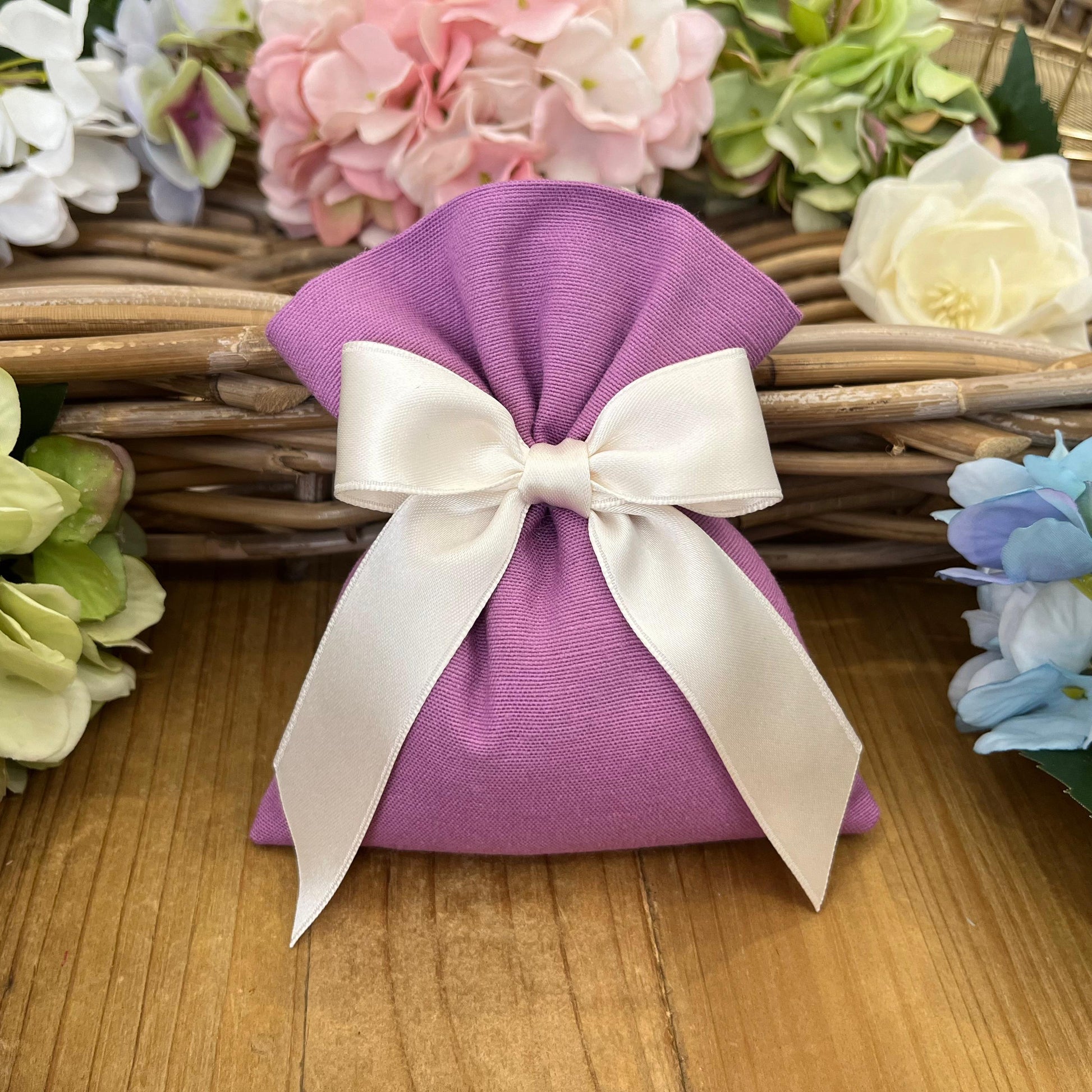 Sacchetto portaconfetti realizzato in tessuto glicine, dimensioni 13x15 cm, composizione 60% cotone 40% poliestere. Il sacchetto viene venduto come in foto, con nastro in doppio raso di 2,5 cm, 7 confetti alla mandorla preincartati monodose e il bigliettino. È possibile scegliere il colore del nastro desiderato. Durante l'ordine, si prega di inserire nelle note i dettagli dell'evento da stampare sul biglietto (evento, nomi, data).