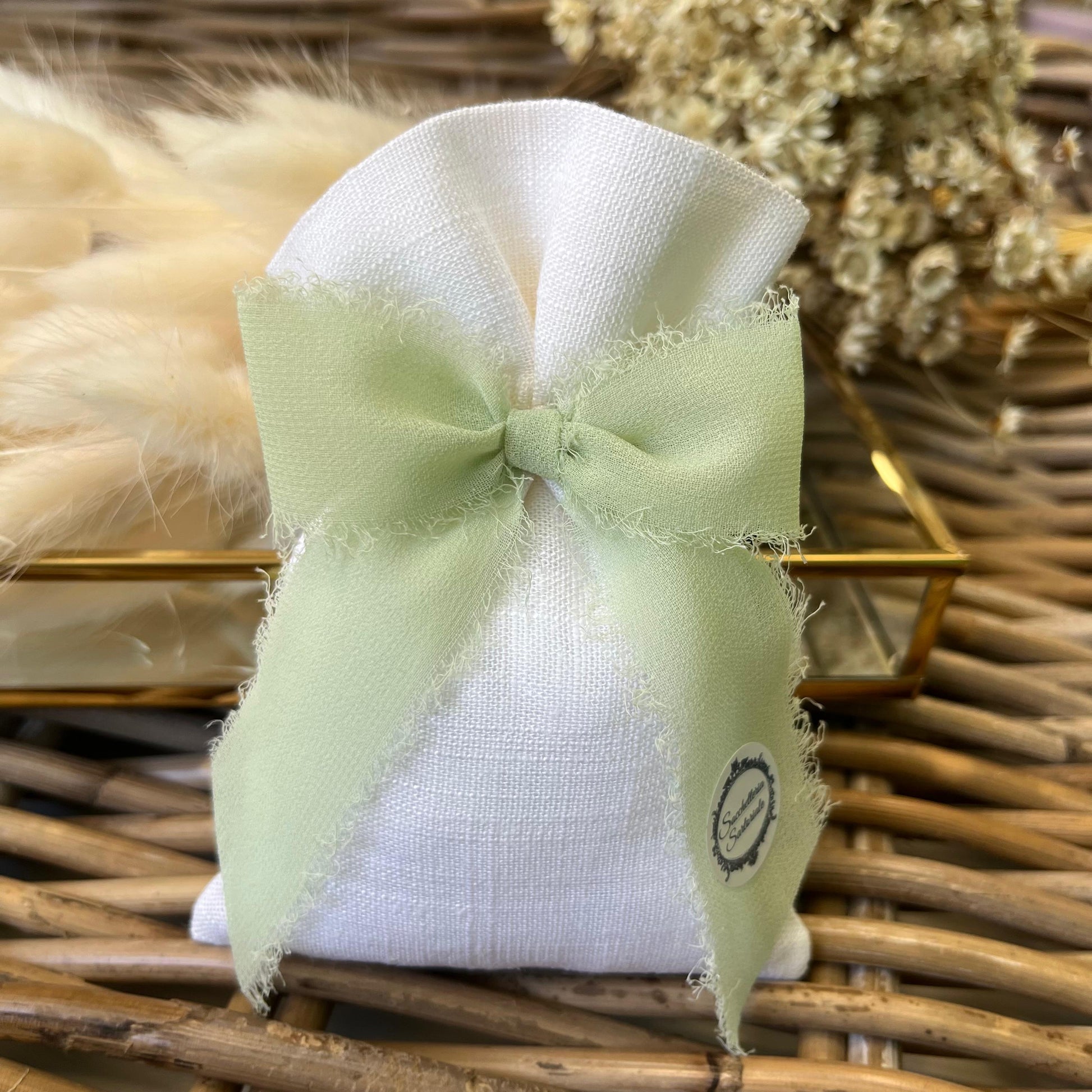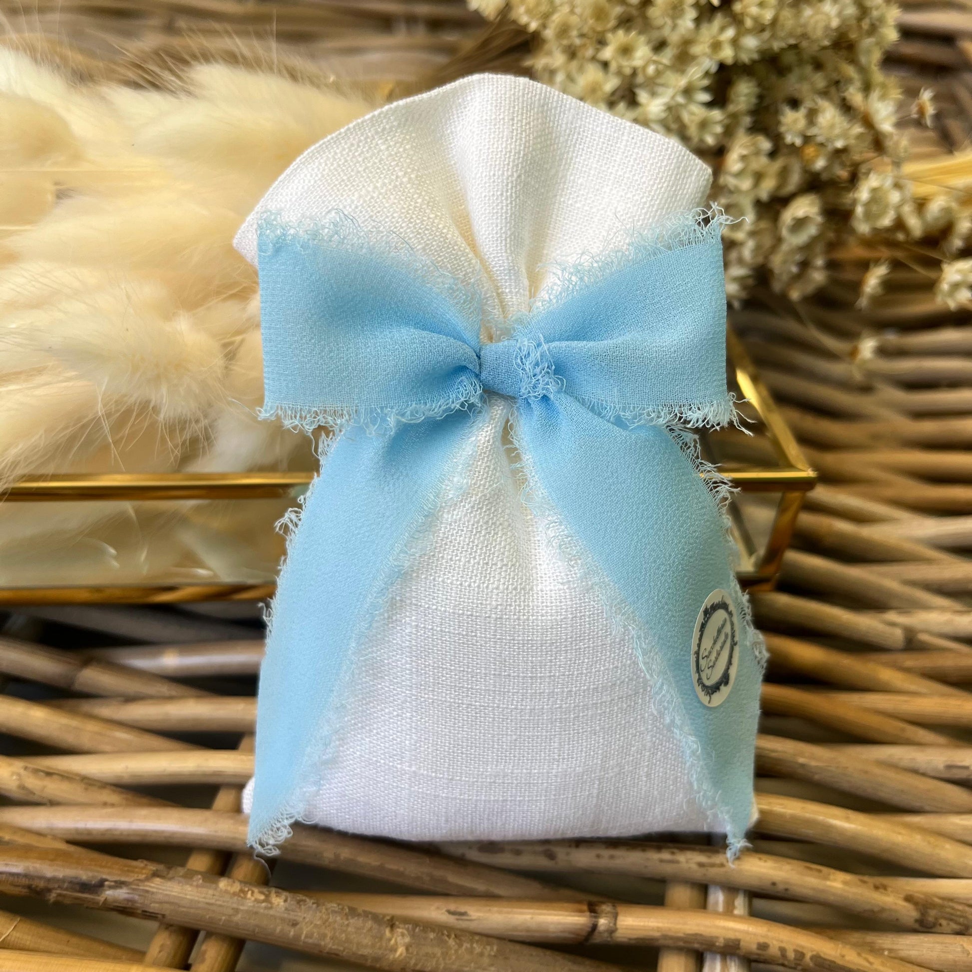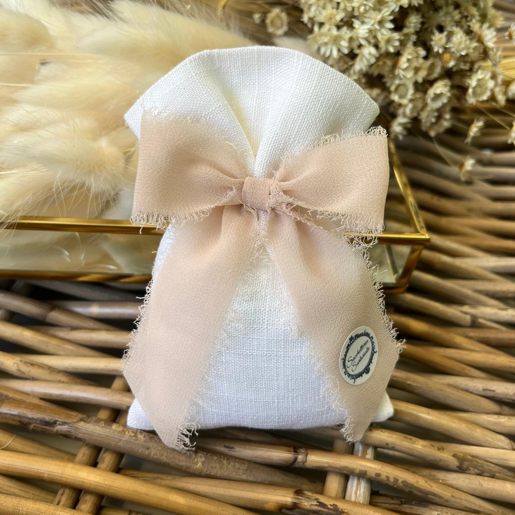 Sacchetto portaconfetti realizzato in tessuto avorio ,dimensioni 9x13 cm, composizione 55% viscosa 45%lino. Il sacchetto viene venduto come in foto, con nastro da 3 cm in chiffon d'organza sfrangiato, 5 confetti alla mandorla d'Avola preincartati monodose e il bigliettino. Durante l'ordine si prega di inserire nelle note i dettagli dell'evento da stampare sul biglietto (evento, nomi, data).