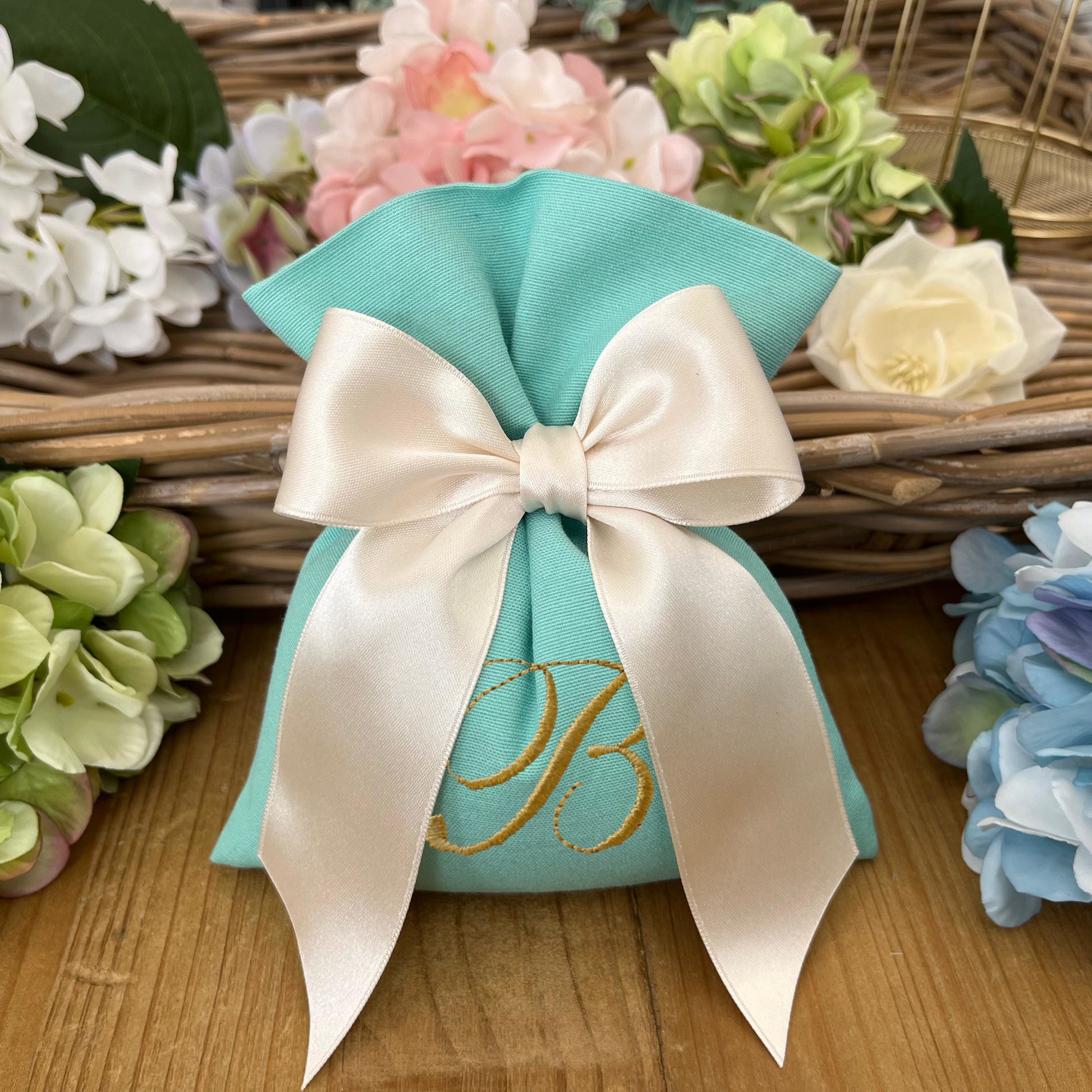 Sacchetto portaconfetti con personalizzazione ricamata, realizzato in tessuto verde acqua, dimensioni 16x19 cm, composizione 60% cotone 40% poliestere. Il sacchetto viene venduto come in foto, con nastro in doppio raso da 4 cm, 11 confetti alla mandorla preincartati monodose e il bigliettino. È possibile scegliere il colore del nastro e il colore del ricamo tra le varianti proposte. Durante l'ordine, si prega di inserire nelle note le iniziali ( da 1 a 3) o il nome da ricamare e i dettagli dell'evento da stampare sul biglietto (evento, nomi, data).
